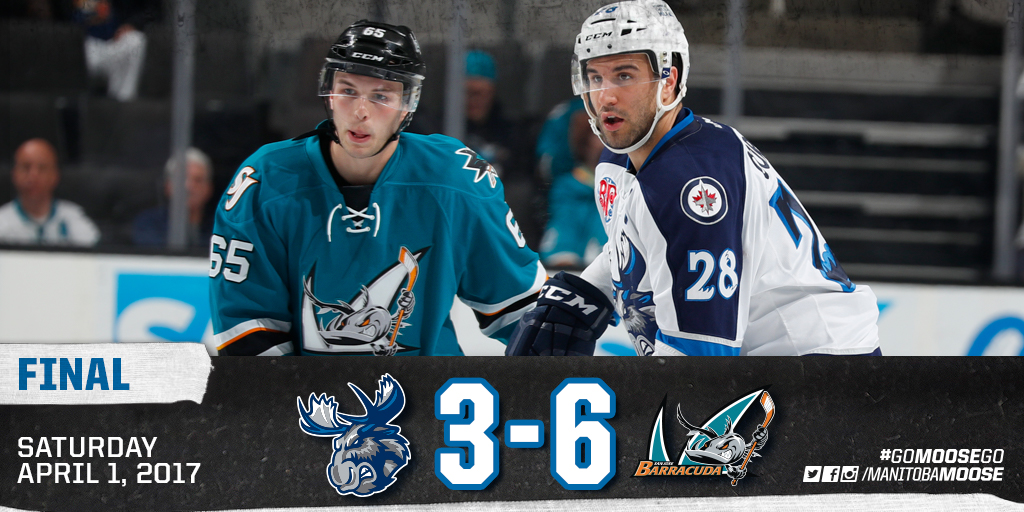 The Manitoba Moose (25-36-4-5) closed out their California road swing tonight in San Jose with their fourth and final matchup against the Barracuda (41-14-2-5) this season. Manitoba netminder Jamie Phillips had to be sharp in the early stages of the first as he faced a flurry of shots from the Barracuda attack. After the Moose impressively shut down the league’s top home ice powerplay for nearly four consecutive minutes, San Jose broke the tie. A rebound hopped off an outstretched Phillips and went right to Buddy Robinson who netted his 14th of the season. The Barracuda added one more to their total with six seconds left on the clock when Ryan Carpenter jammed the puck between Phillips and the post to double San Jose’s lead through 20 minutes.