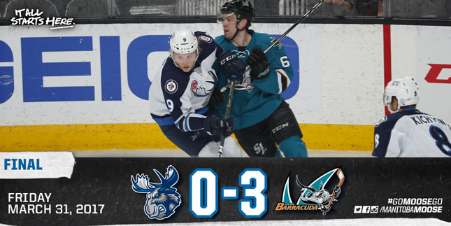 The third period saw the Moose get the Barracuda back under wraps, allowing just seven shots to head in Comrie’s direction. Going the other way, Manitoba mustered 10 shots in the final frame. One puck did manage to get behind Troy Grosenick in the San Jose net, but contact on the goaltender from the scramble resulted in the possible goal being immediately waved off. The Moose weren’t able to solve Grosenick on 26 shots as the Barracuda skated to their 40th win of the season by a 3-0 score.