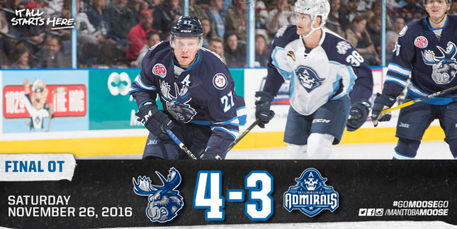The Manitoba Moose (8-7-1-1) met with the Central Division leading Milwaukee Admirals (12-2-2-1) for the first time this season on Saturday night. The Admirals got on the board first, checking in 4:22 into the game. Cody Bass kept on a two-on-one and picked the far corner with a perfect shot. The Admirals held that one goal lead until the final minute of the first. JC Lipon battled the puck free behind the net and hit the red-hot Dan DeSalvo on the tape for the tying goal and a 1-1 game after twenty.