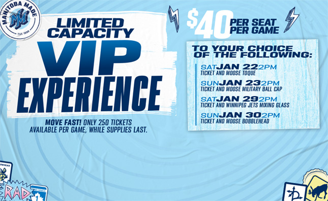 Due to current provincial health orders limiting large gatherings, the Manitoba Moose games on January 22, 23, 29 and 30 will be played with a limited capacity of 250 fans.