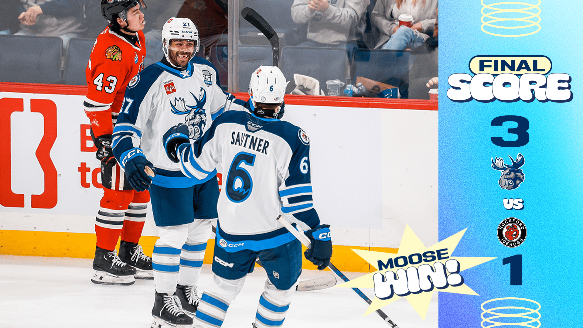 The Manitoba Moose (3-3-0-0) bounced back with a 3-1 win over the Rockford IceHogs (2-3-0-0) in Sunday afternoon’s game. The Moose were coming off a 5-3 loss against Rockford the day before.