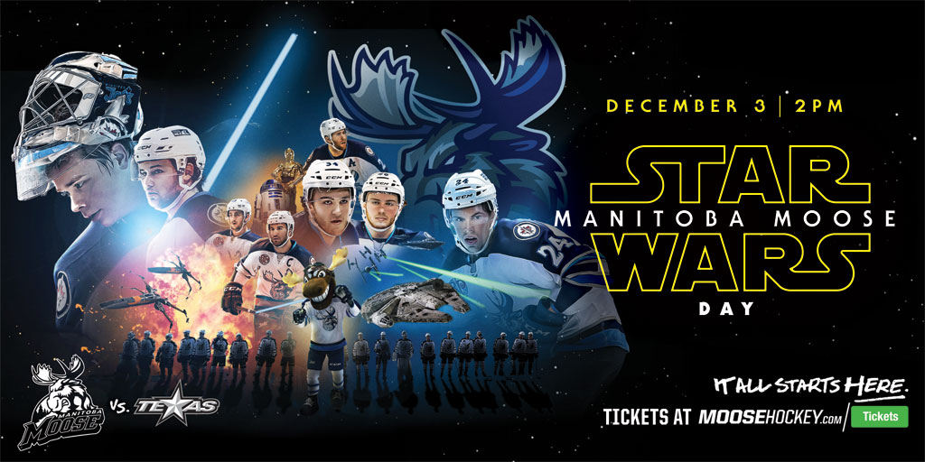The Manitoba Moose Hockey Club is pleased to announce details for Star Wars Day on Saturday, Dec. 3 when the Moose face the Texas Stars in a 2 p.m. CT puck drop at the MTS Centre.