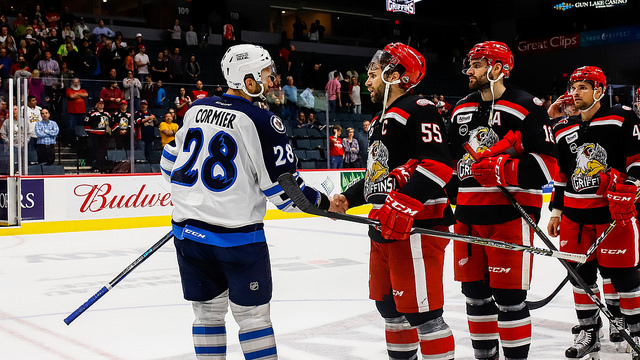 Manitoba was blanked by Jared Coreau for a third time on the season, and Grand Rapids took advantage of two turnovers late in the second period en route to a 3-0 series-leveling victory.