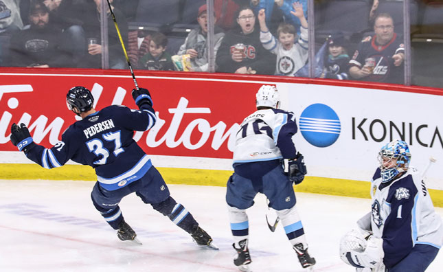 and accept a perfect stretch pass from Logan Stanley. Pedersen, who came into the contest with two goals on the season, turned on the jets and drove around Davies to get to the net. Once there, Pedersen showed off some great finish to lightly flick the up and under the crossbar to finally supply the game's first goal.