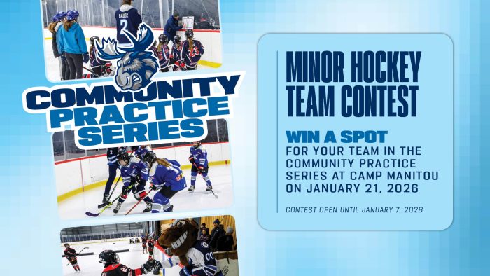 Minor hockey teams can enter this contest by confirming their attendance to the Manitoba Moose Minor Hockey Weekend on January 31 or February 1. If the team order is confirmed by Wednesday, January 7, the team will get an entry form for a chance to win a spot in the Community Practice Series!
