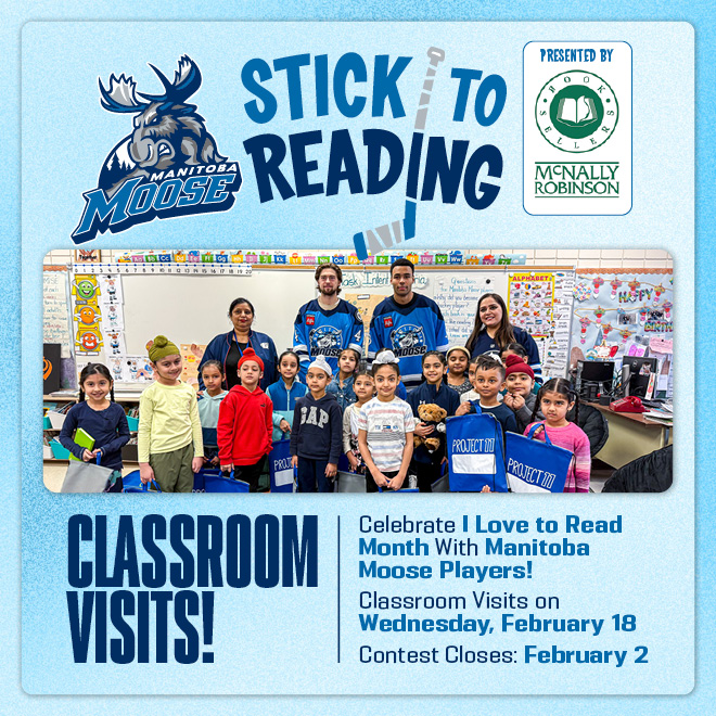 Students and teachers from local schools can enter their class for a chance to win a visit from Manitoba Moose players. During the visit, Moose players will read to the students and participate in a Q&A. All winning classes will receive books and a swag bag courtesy of McNally Robinson.