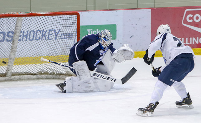 A couple former Colorado Eagles (ECHL edition) hooked up early in the third to give Team White a two-goal edge. Joey Ratelle slipped a feed ahead to send Cam Maclise in behind the defence. Maclise picked the far top corner to move the score to 3-1. Team Blue didn’t go away quietly, pulling back within one after Jansen Harkins set up Matt Marcinew with a cross-crease feed. Blue continued to press in the late stages with the extra attacker, but White held on for the 3-2 victory.