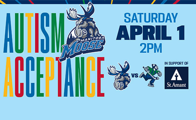 The Manitoba Moose Hockey Club is proud to announce the beginning of this season’s Autism Acceptance campaign, in support of St.Amant Foundation. The campaign is highlighted by the Autism Acceptance Game on Saturday, April 1 at 2 p.m. CT when the Moose face the Abbotsford Canucks at Canada Life Centre.