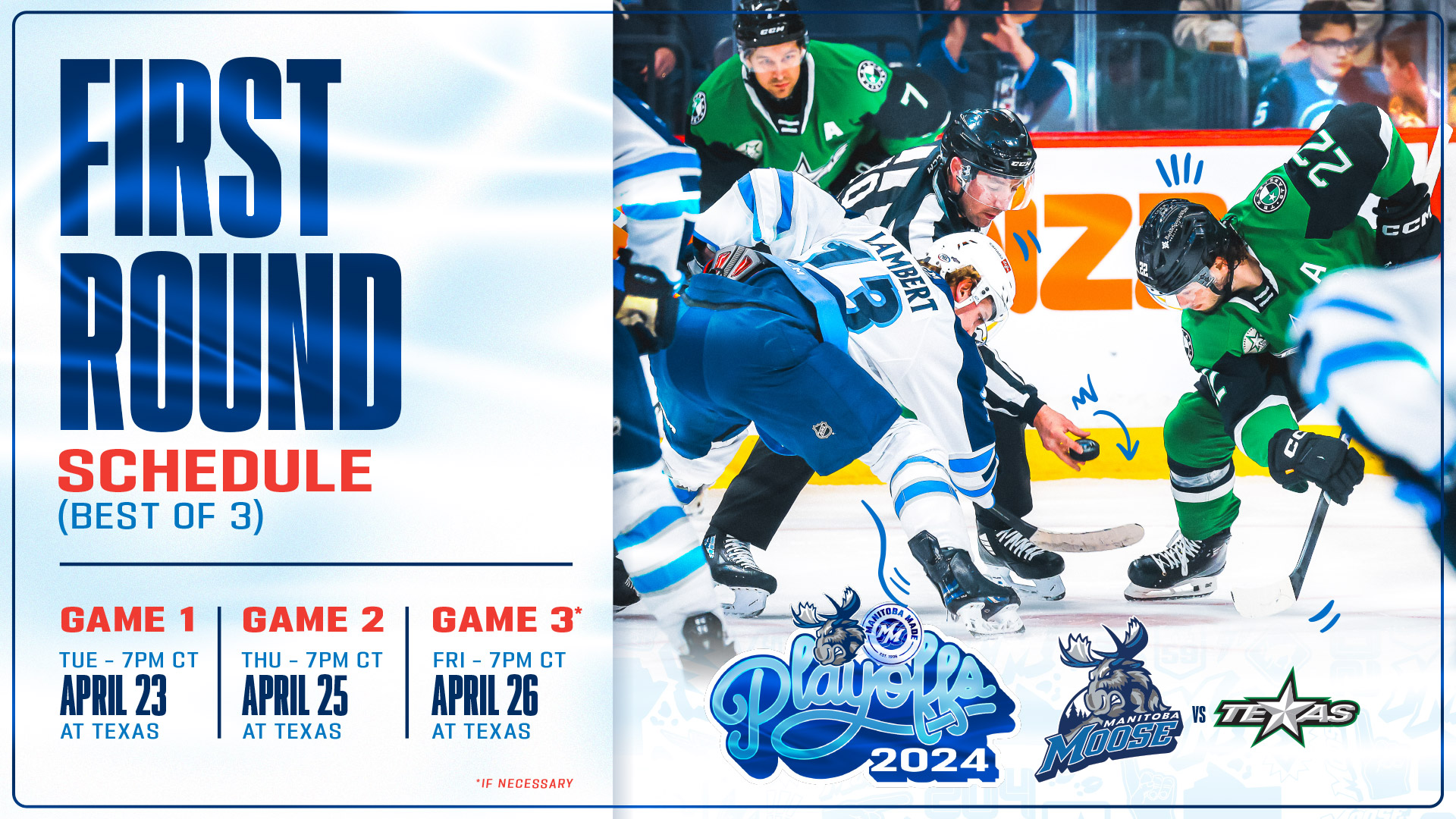 The Manitoba Moose Hockey Club, in conjunction with the American Hockey League and Texas Stars, announced today the schedule for their 2024 Calder Cup Playoffs First Round series.