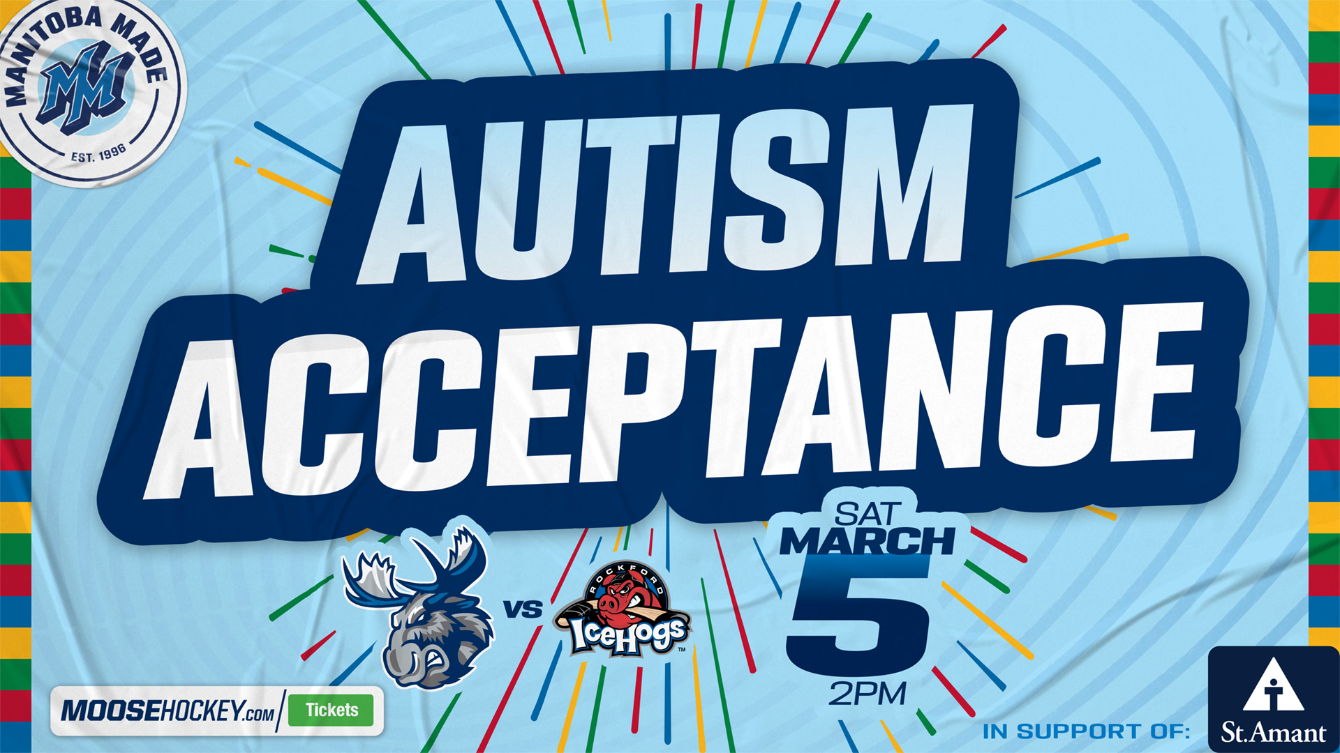 Tickets for Manitoba Moose home games, including Autism Acceptance Game on Saturday, March 5, are available now at MooseHockey.com/TICKETS.