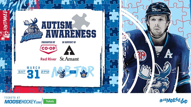 Winnipeg, MB - The Manitoba Moose Hockey Club is proud to announce the beginning of this season's Autism Awareness campaign, highlighted by Autism Awareness Day, presented by Red River Co-op in support of the St.Amant Foundation, on Saturday, March 31 at 2 p.m. CT.