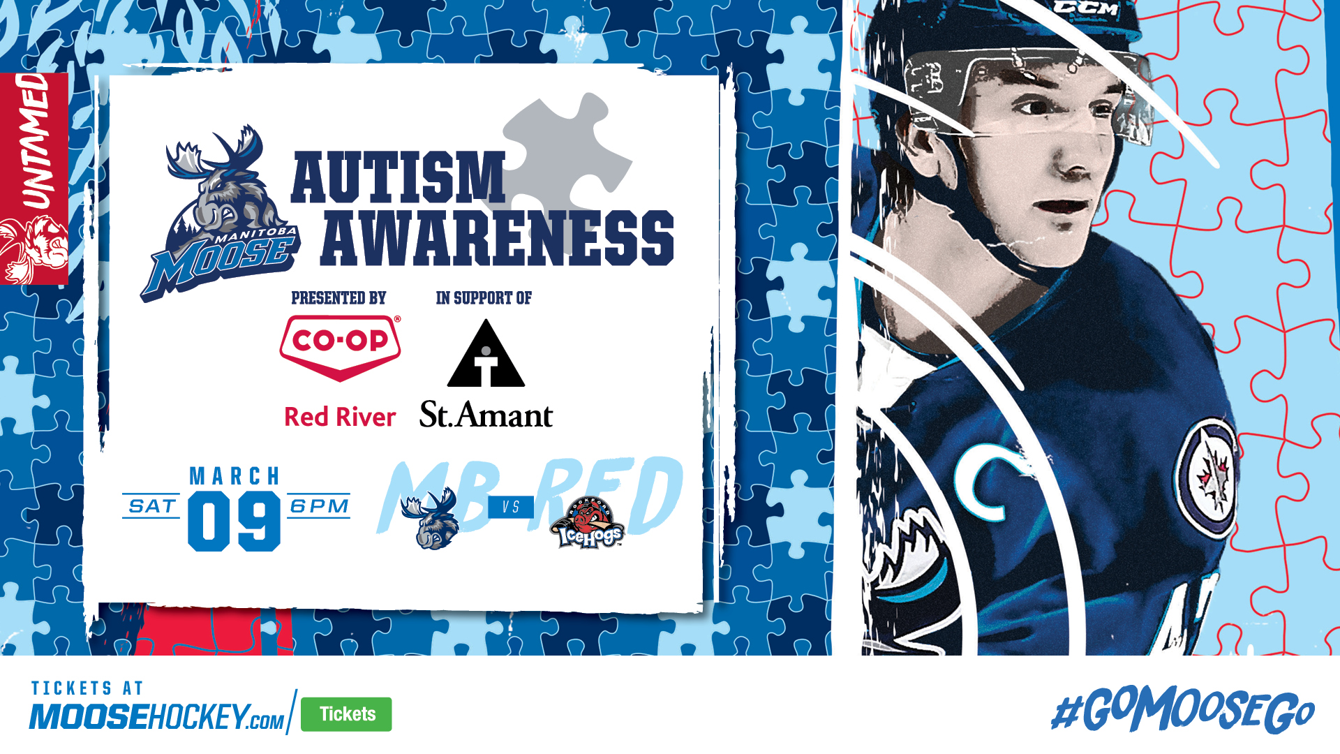 Tickets for Manitoba Moose home games, including Autism Awareness Game on Saturday, March 9, are available now at moosehockey.com/tickets.