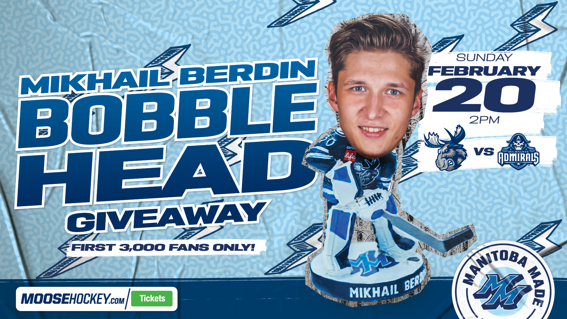 The Manitoba Moose are excited to announce the first mini bobblehead giveaway of the 2021-22 season is goaltender Mikhail Berdin! Fans can add the mini-Berdin to their collection at the game on Sunday, February 20th at 2PM. Make sure to arrive early, only the first 3,000 fans in the building are going home with a bobble!