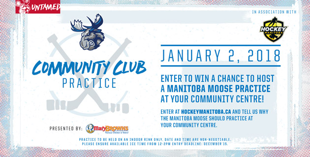 Minor hockey teams interested in hosting the Moose as part of the Manitoba Moose Community Club Practice, presented by Mary Brown’s, are encouraged to enter their team for a chance to win. Practice will take place Tuesday, Jan. 2, 2018 and ice time would need to be available from 12 - 2 p.m.