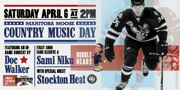 The Manitoba Moose take on the Stockton Heat on Saturday, April 6, for their first-ever Country Music Day as part of the club’s final weekend at home of the regular season.