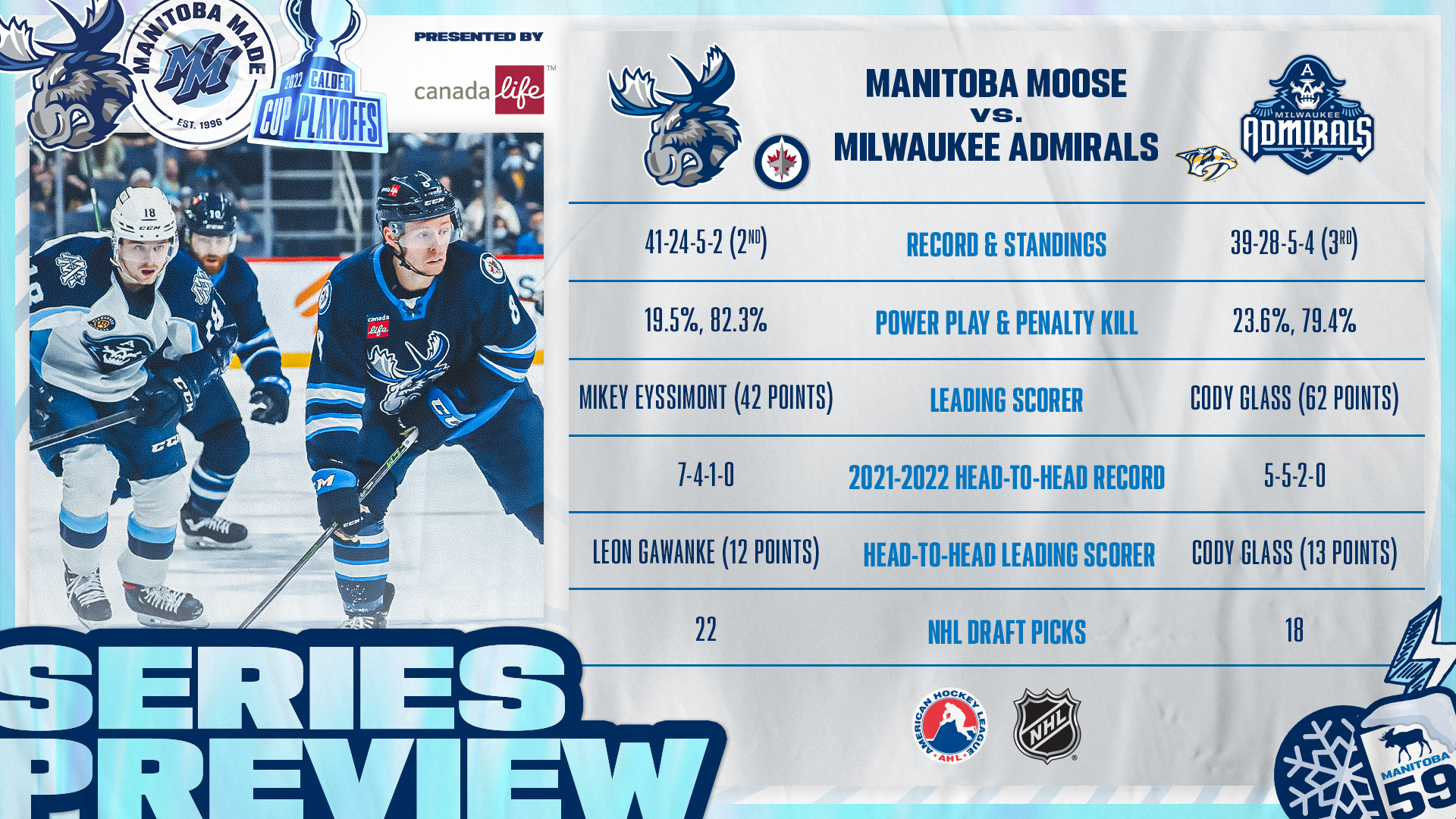 The Manitoba Moose begin their quest for the Calder Cup on Friday, May 6 in Milwaukee. The Moose and Admirals clash in the best-of-five Central Division Semifinals.