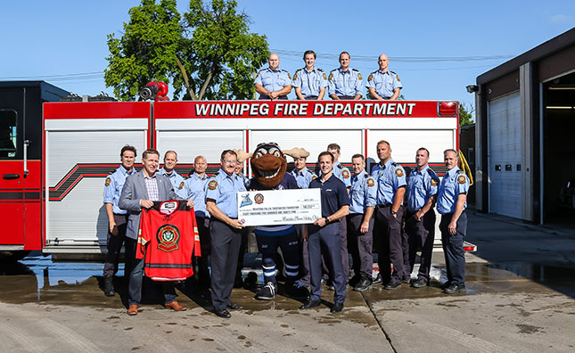 Winnipeg, MB - Manitoba Moose Vice-President of Operations Dan Hursh and Mick E. Moose stopped by Winnipeg Fire Paramedic Service No. 1 Station on July 7 to present the funds raised by the team's Firefighter Appreciation day on Jan. 15.