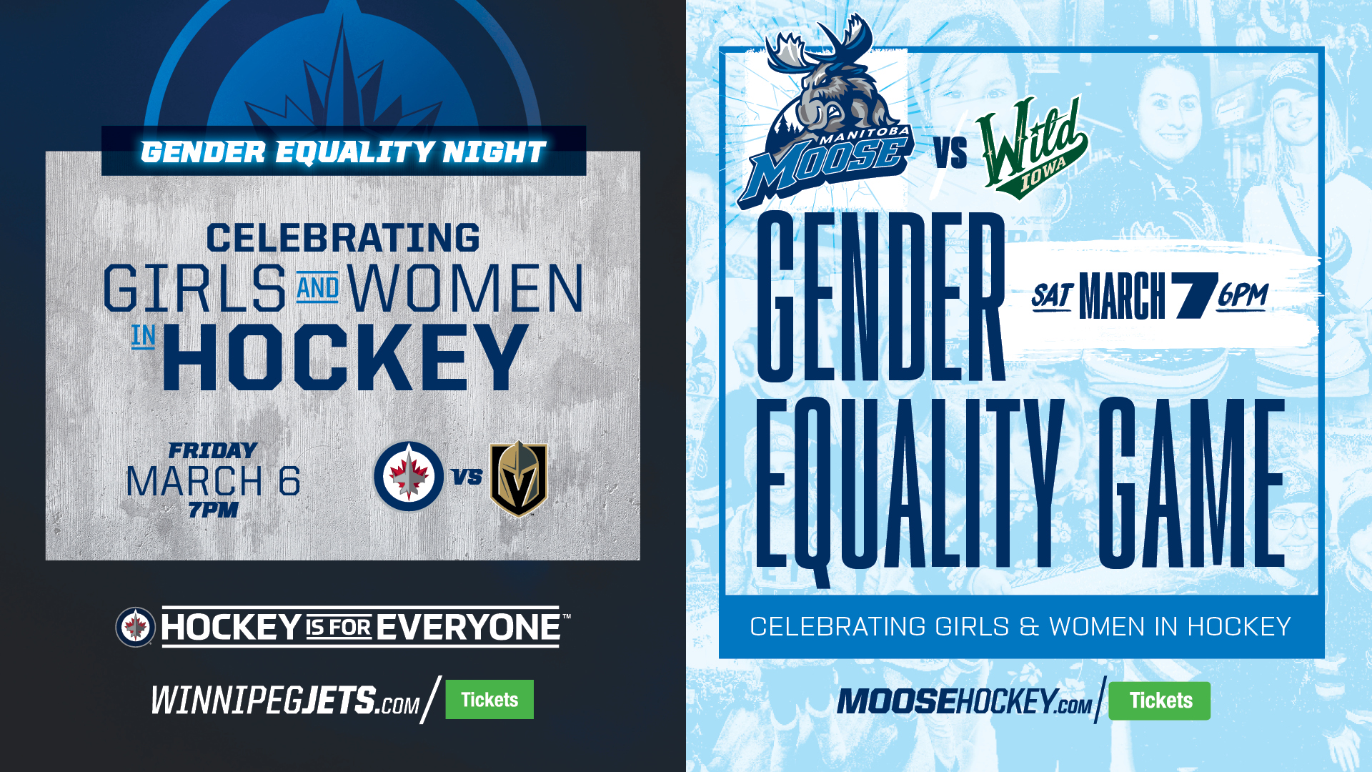 Tickets to the Jets and Moose Gender Equality games are available at WinnipegJets.com/TICKETS and MooseHockey.com/TICKETS.