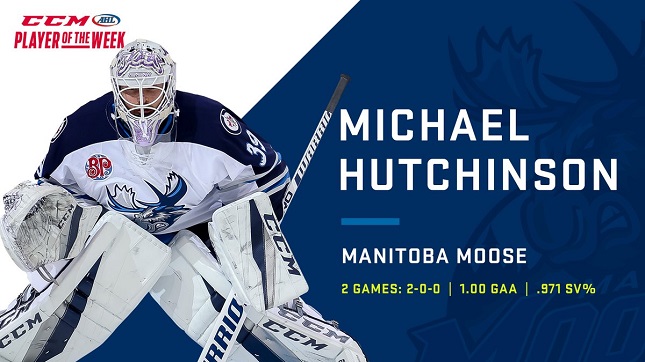 Winnipeg, MB – The Manitoba Moose, in conjunction with the American Hockey League, announced today goaltender Michael Hutchinson has been selected as the CCM/AHL Player of the Week for the period ending Dec. 17.