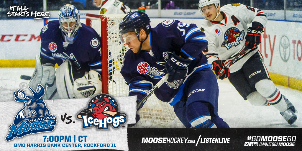 For the second time this season the Manitoba Moose (11-10-2-2) head to BMO Harris Bank Center in Rockford, IL, where they’ll take on the IceHogs (7-13-2-3) tonight at 7:00 p.m. CT.