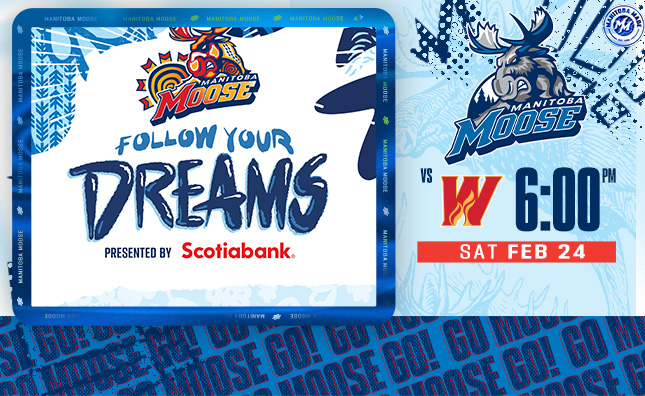 The Moose Follow Your Dreams Day game takes place Saturday, Feb. 24 at 6 p.m. vs. the Calgary Wranglers, starting with a ceremonial puck drop honouring Indigenous youth and the singing of the national anthem by the Sergeant Tommy Prince School choir. Fans will have the chance to learn about various Indigenous art forms from local artists, including Fredrick Lyle Spence, Blanche Chief, Tashina Schlup, WaaBooz (Jennifer Wood), and Claire Johnson, who will showcase Métis beading with kits available for youth to take home.