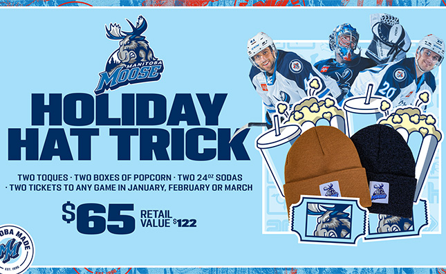 Holiday Hat Tricks are available for purchase HERE (https://offer.fevo.com/manitoba-moose-holiday-hattrick-4p73i5i-ff2f515?fevoUri=manitoba-moose-holiday-hattrick-4p73i5i-ff2f515%2F) or at any Winnipeg Jets Gear locations.
