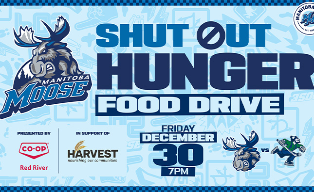 The Moose will host their annual Shut Out Hunger game on Friday, December 30 when they take on the Abbotsford Canucks. Puck drop is scheduled for 7 p.m. CT. Tickets to the Moose Shut Out Hunger game are available by clicking here.