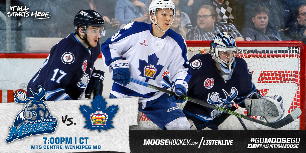 It’s an all-Canadian matchup at the MTS Centre this evening as the Manitoba Moose (13-12-3-2) host the Toronto Marlies (13-15-1-1) for the first half of a two-game set at 7:00 p.m. CT.
