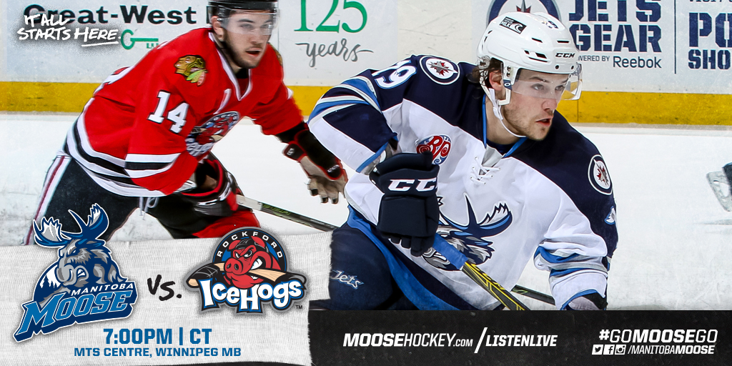 For the first time this season, the Manitoba Moose (19-26-3-3) welcome the Rockford IceHogs (19-24-8-3) to MTS Centre tonight as they open a two-game set with their Central Division rival at 7 p.m. CT.