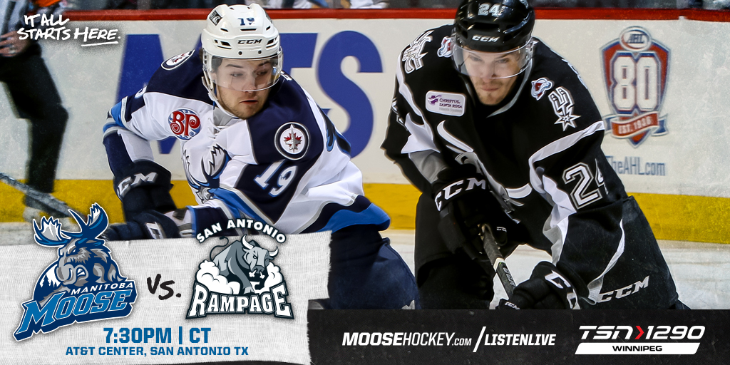 The Manitoba Moose (15-18-3-2) continue their tour of the Lone Star State this evening (7:30 p.m. CT) when they head into the AT&T Center for a matchup with the San Antonio Rampage (16-19-4-0).