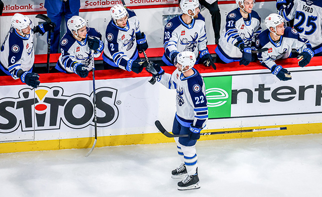 Manitoba pushed further ahead 4:14 into the middle frame. Chaz Lucius directed a shot on goal that snuck past McIntyre. The puck stopped on the goal line before C.J. Suess poked it home. The Moose added further insurance with a goal from Axel Jonsson-Fjallby. The forward curled in from the blue line and unleashed a bullet past McIntyre. Manitoba converted again just over a minute later as Parker Ford was sprung on a breakaway, with the help of a Capobianco and Delia passing play, and slid the disc home on the backhand. Manitoba added another goal shortly after with the teams skating four-on-four, as Kyle Capobianco’s backhand from the slot found twine.