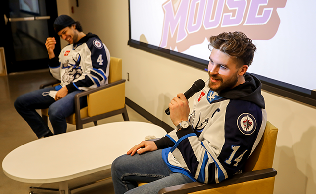 Oligny was involved in the Moose Community Practice Series (March 7), where four minor hockey teams won an outdoor practice at Camp Manitou led by instructors from Jets Hockey Development. The skate was followed by a Q&A with Oligny and fellow defenceman Johnathan Kovacevic. The father of three also participated in a welcome video and wrapped gifts for children attending the Moose Holiday Game (Dec. 11) from the Children’s Rehabilitation Foundation.