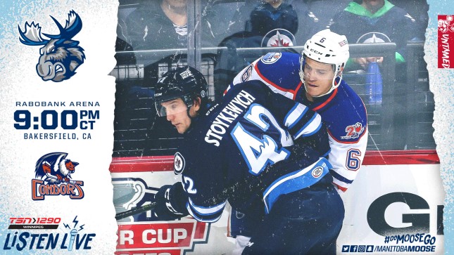 The Manitoba Moose (10-10-1-0) move on to Bakersfield to take on the Condors (9-8-0-0) tonight at 9 p.m. CT. The match-up will be the third of six games on Manitoba's current California road trip and you can catch it on moosehockey.com/listenlive, the Moose App, or streamed live on AHLTV. TSN 1290 will join the game in progress after their coverage of the Winnipeg Jets game against the New Jersey Devils.