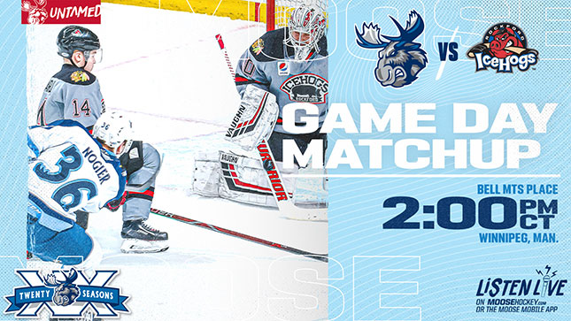 Puck drop today is 2 p.m. at Bell MTS Place. Tickets are available at moosehockey.com/tickets. Coverage of today’s game on moosehockey.com/listenlive and AHLTV begins at 1 p.m. with Moose Weekly hosted by Austin Siragusa.