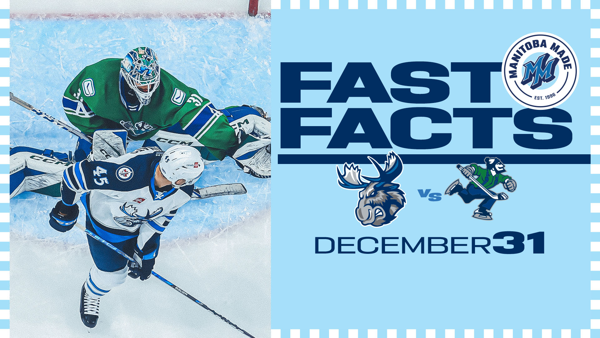 The Moose playing on New Year’s Eve has been a Winnipeg tradition since the team arrived from Minnesota in 1996. Even when the franchise relocated to St. John’s, the club played New Year’s Eve contests, though mostly on the road. Including their IHL and St. John’s days, the Moose hold a 14-8-0-0 record on Dec. 31. When playing their traditional game in Winnipeg, the Moose hold a 13-4-0-0 record, and have won nine straight New Year’s Eve games on home ice. The only year the Moose didn’t play on New Year’s Eve was 2016 when the club played Dec. 30 and Jan. 1.