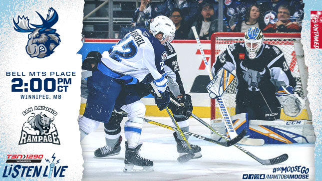 In the fifth game of their home stand, the Manitoba Moose (17-18-2-1) play their fifth game of the season against the San Antonio Rampage (21-18-1-0). Today's matchup, starting at 2 p.m. CT, is also the club's Grassroots Hockey Day. For tickets, visit moosehockey.com/tickets/. If you can’t make it down to Bell MTS Place, tune in on moosehockey.com/listenlive/, the Moose App, AHLTV, or on TSN 1290 up until their coverage of the Winnipeg Jets and Dallas Stars begins.