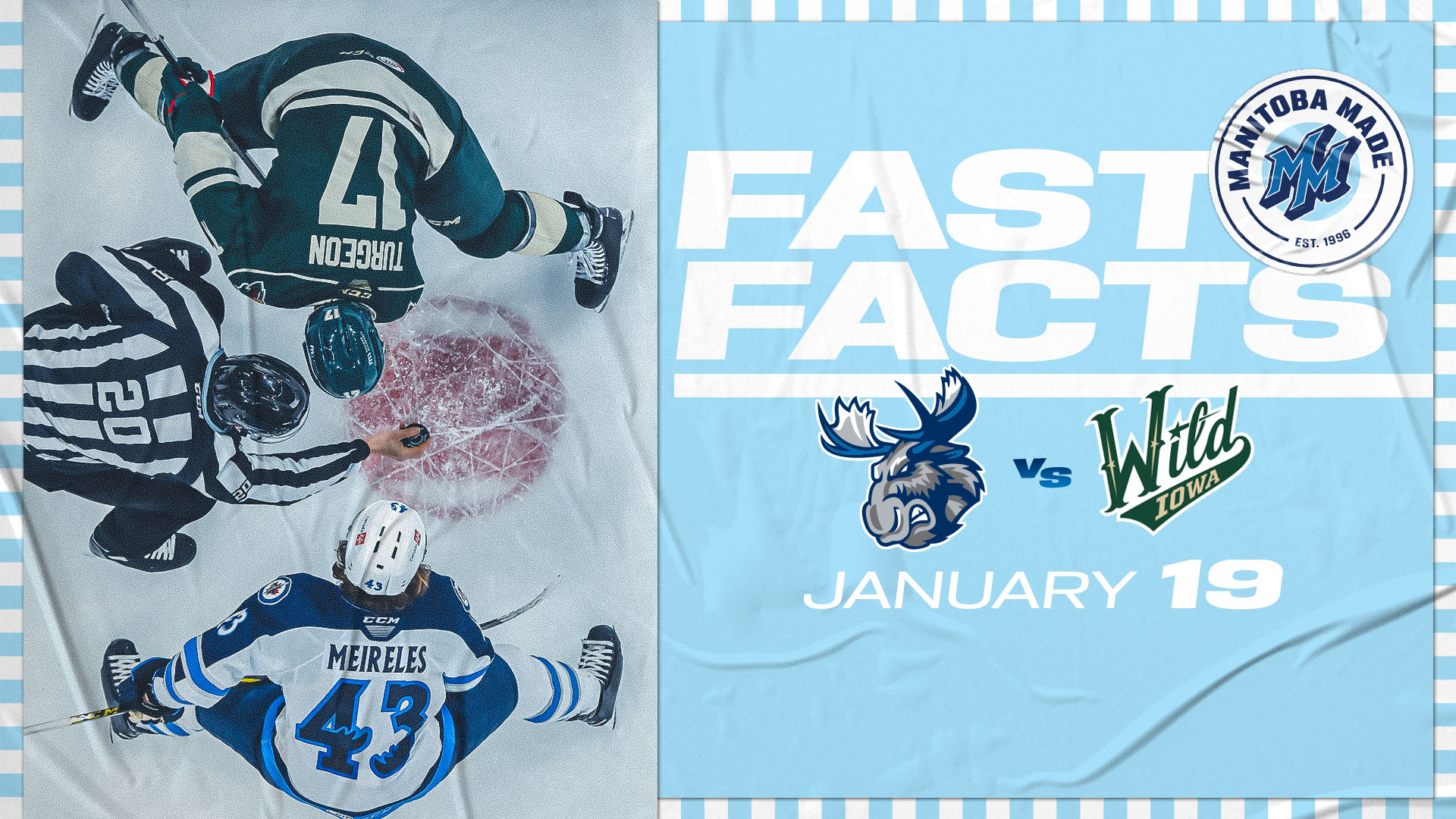 The Moose put the wraps on a successful road swing tonight in Iowa. Manitoba is 4-0-1-0 on the trip following a 2-1 shootout win in Grand Rapids on Saturday. The Moose and Wild split their previous two games back in Winnipeg to open the new year. Coverage of tonight’s game on CJOB.com/sports, AHLTV and the Manitoba Moose App gets going at 6:45 p.m. CT.