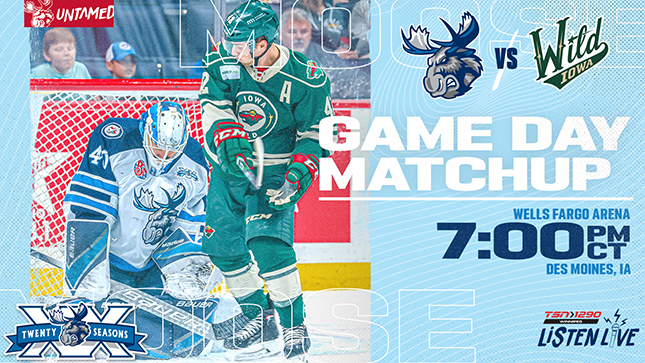 Coverage of tonight’s game on TSN 1290, moosehockey.com/listenlive and AHLTV gets going at 6 p.m. CT. Austin Siragusa leads things off with Moose Weekly and the pre-game show takes over at 6:45 p.m. before a 7 p.m. puck drop.