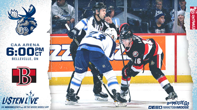 The Manitoba Moose (26-25-3-2) are in Belleville for a two-game set against the Senators (29-23-2-4) to end their six-game road trip through Eastern Canada. The 6 p.m. CT puck drop at CAA Arena will be available on moosehockey.com/listenlive/, the Moose App, and streamed live on AHLTV.