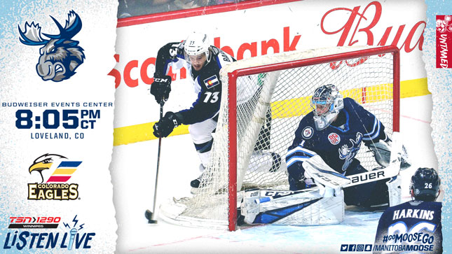 The Manitoba Moose (31-27-4-2) make their first trip to Loveland, Colo. the home of Colorado Eagles (33-23-3-1) for tonight’s 8:05 p.m. CT puck drop. It’s the start of a five game Moose road trip and their fifth straight contest against a Pacific Division team. Tune in on TSN 1290, moosehockey.com/listenlive/, the Moose App, or stream the game live on AHLTV.