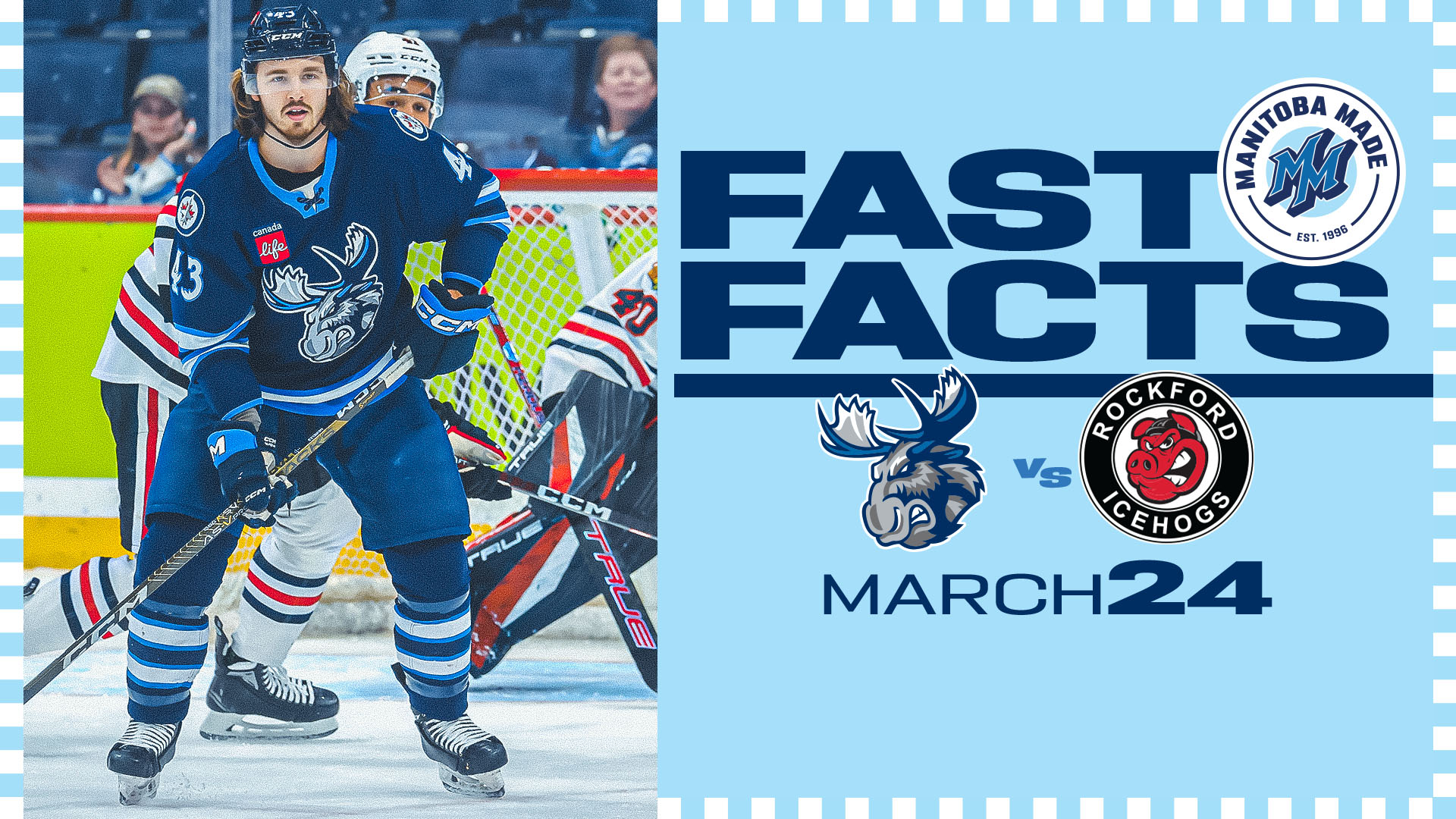 The Manitoba Moose face off against the Rockford IceHogs in a rematch of Wednesday’s tilt. The previous meeting between the teams saw the Moose tie the contest with 11 seconds remaining in regulation, but fall 4-3 in a shootout. Jansen Harkins led the way for the Moose with two goals and an assist in the loss, while Rocco Grimaldi scored in regulation and the shootout winner for the IceHogs. With the point, and Chicago’s regulation loss on Wednesday, the Moose are eight points away from clinching a spot in the Calder Cup Playoffs. Tickets for tonight’s 7 p.m. game are available at MooseHockey.com/TICKETS.