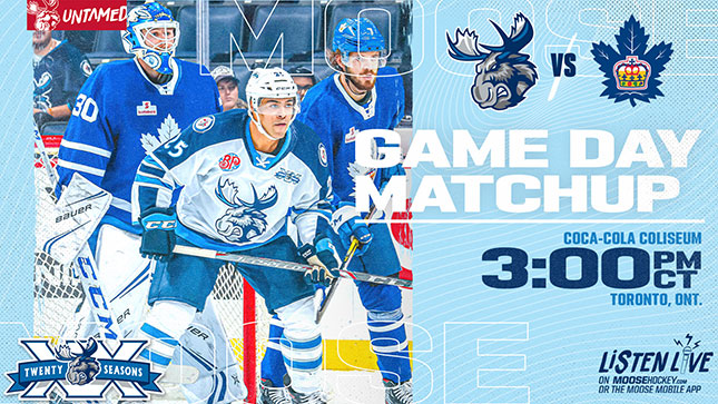 Puck drop between the Moose and Marlies is at 3 p.m. CT today. Coverage of the game starts at 2 p.m. with Moose Weekly hosted by Austin Siragusa. Tune in on moosehockey.com/listenlive and AHLTV.