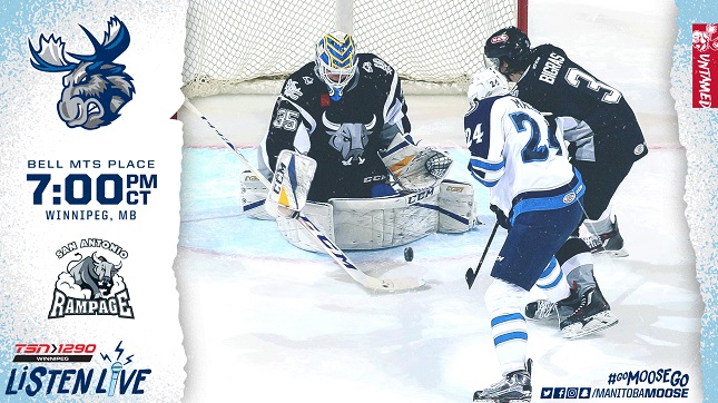 The Manitoba Moose (1-3-0-0) continue their four-game home stand tonight against the San Antonio Rampage (1-3-0-0). Puck drop is slated for 7 p.m CT, and you can still get tickets at moosehockey.com/tickets/. You can also tune in to TSN 1290, moosehockey.com/listenlive/ or the Moose App for the action.