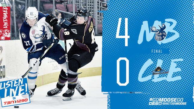 The Manitoba Moose (41-25-4-4) began their season-ending three-game road trip Thursday night against the Cleveland Monsters (24-40-7-3). It didn't take long for the Moose to open the scoring. The game was less than five minutes old when Brody Sutter extended his point streak to six games. Sutter notched his fourth goal over that stretch when he chose to shoot instead of pass on a two-on-one with JC Lipon. C.J. Suess had the primary assist on the goal, the first of his professional career. The Monsters responded to the early deficit with physicality, including a big hit by Hayden Hodgson on Manitoba's Jake Kulevich. That physicality led to a high hit on Brendan Lemieux resulting in the first power play of the game. Lemieux then led the break-in on that man advantage. Off the rush, he dished the puck to Michael Spacek, who drew coverage before finding Mason Appleton for the tap in at 16:47 of the first.