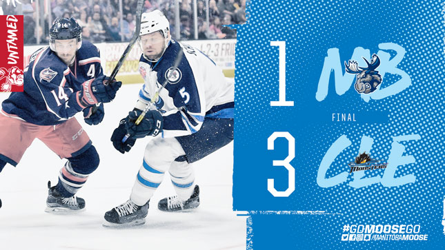 Cleveland grabbed its first lead of the contest 7:33 into the third as Koules stole the puck in the Moose zone and fired it past Eric Comrie. Cleveland continued to push the pace in the final frame, outshooting the Moose by a 13-5 count. The Monsters picked up some insurance with 2:40 to go when Calvin Thurkauf capped off a two-on-one with former Moose Jordan Schroeder supplying the setup. That score held until the final buzzer as the Moose fell by a 3-1 score to the Monsters.