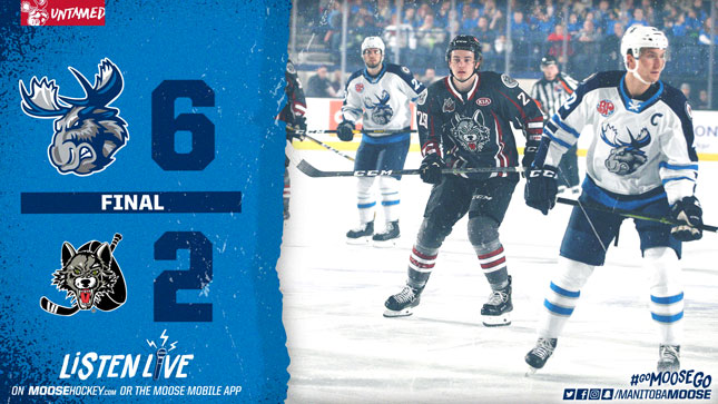 The floodgates opened midway through the third as the Moose scored four goals in a span of 5:17. Logan Shaw got it started at 6:42 of the period by scoring on a nice pass from Marko Dano on the power play. Kamerin Nault made it 4-1 a minute later, scoring on a partial break down the wing. Less than two minutes after that, Jansen Harkins sniped after an offensive zone faceoff win for a 5-1 advantage. Cole Maier rounded out the run with eight minutes to go, shoveling the puck up and over Lagace during a scramble in the Chicago crease. Former Moose Tye McGinn added one more for Chicago with six minutes to go in the contest, finishing off a pass from below the goal-line to leave the final score at 6-2 in favour of the Moose.