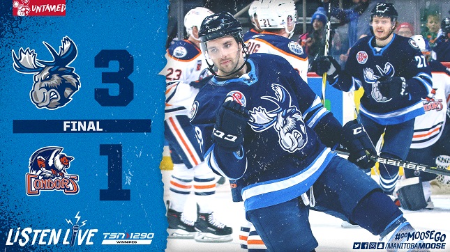 The Manitoba Moose (35-28-5-2) ground out a 3-1 victory over the Bakersfield Condors (39-19-3-2) on Tuesday evening at Bell MTS Place. Mikhail Berdin and the Moose power play got the home side off to a good start. The rookie goaltender stopped all 12 shots he faced in the opening frame to keep the Condors off the board. Meanwhile the Moose power play cashed in on its second opportunity of the period as Seth Griffith got the puck in the slot with room to pick his spot and hit it with 2:23 to go in the first.