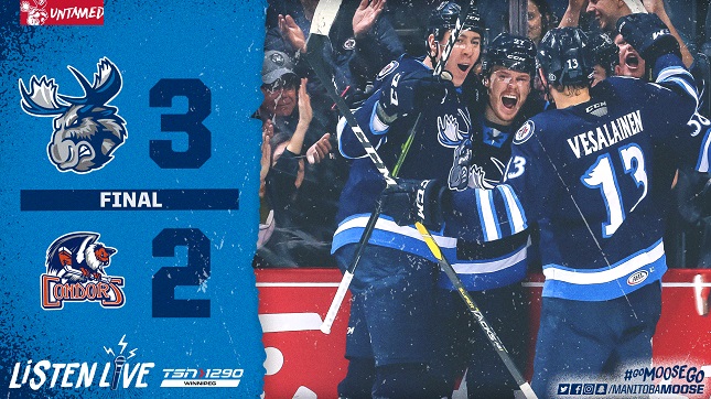 The Manitoba lead lasted until the 4:43 mark of the third when William Lagesson was able to lean into a shot from the slot and hit the twine. The game stayed locked at 2-2 until the Moose struck with 3:28 left on the clock. Vesalainen worked the puck to Shaw in front for a shot, and Mason Appleton pounced on the rebound to put the Moose in front. A late Condors penalty assisted the Moose in defending their late lead as they grabbed a second straight win, 3-2 over Bakersfield.