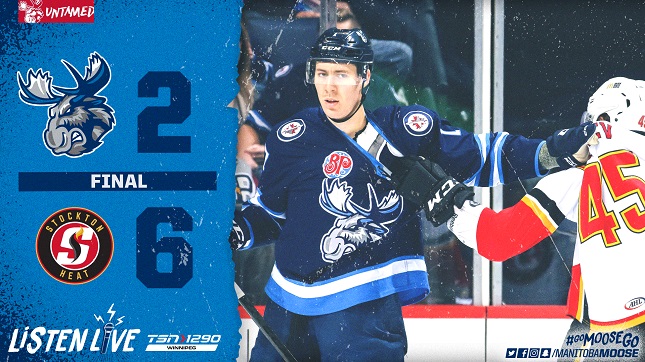 The Manitoba Moose (37-29-5-2) fell 6-2 to the Stockton Heat (30-29-4-2) in their final home game of the regular season Sunday afternoon at Bell MTS Place. The visitors got on the board first courtesy of an early five-on-three power play goal. Glenn Gawdin slung a pass through the seam to Ryan Lomberg who snapped the puck past a lunging Mikhail Berdin. The Moose had three glorious opportunities to tie the game the rest of the way, but Stockton netminder Tyler Parsons robbed Felix Girard, Nelson Nogier and Logan Shaw to keep the Heat in front. Manitoba outshot Stockton by a 14-5 count in the period, but trailed 1-0 after 20 minutes.