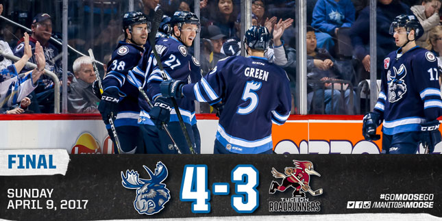 The Manitoba Moose (28-36-5-5) closed the book on their 2016-17 home schedule at MTS Centre on Sunday afternoon against the Tucson Roadrunners (26-31-7-0). A raucous crowd came to its feet 6:50 into the game when Francis Beauvillier jammed home a rebound to open the scoring for Manitoba. With just over seven minutes remaining in the period, Darren Kramer busted in off the wing and his shot beat Marek Langhamer to build the Moose lead to 2-0. Tucson got one back before the end of the period as Chris Mueller struck on the power play with 2:08 remaining to put the score at 2-1. Dan DeSalvo nearly restored the two-goal edge, but his shot found iron with five seconds left.